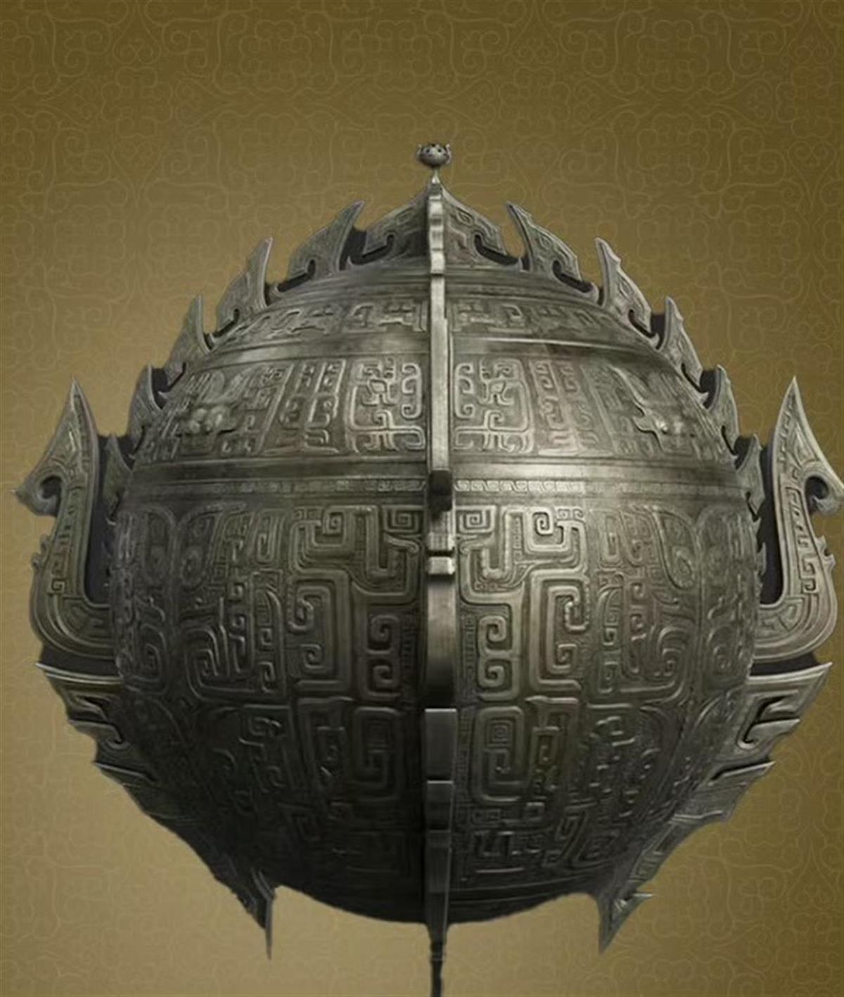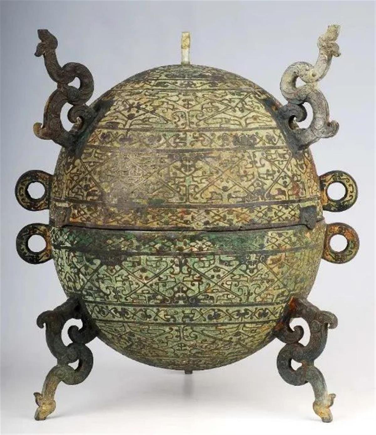 此外,也有文博迷发现,随州市博物馆所藏的菱形勾连云纹铜敦,也与天元鼎的造型极为相似。随州市博物馆公开资料显示,该器物呈椭圆球体,盖和身形状一样,盖口部有三个舌形扣钮,可扣合,器物的盖和身分别有3个扁状透空兽形钮、足,口部均有两个对称环形耳。通体饰菱形勾连云纹、三角几何纹、涡纹。